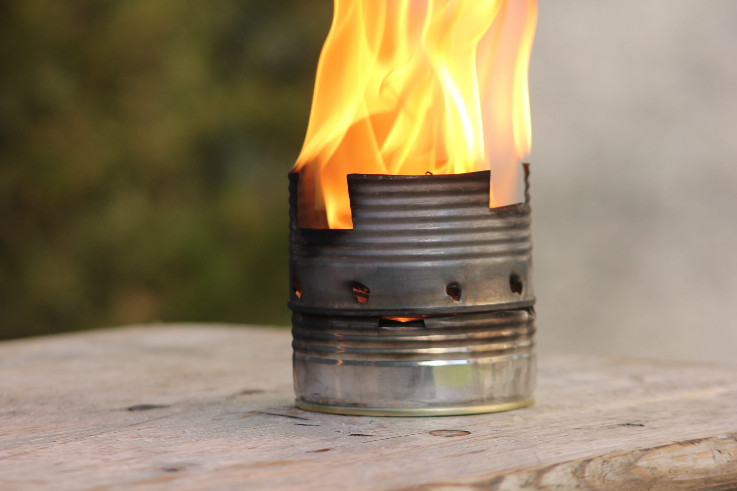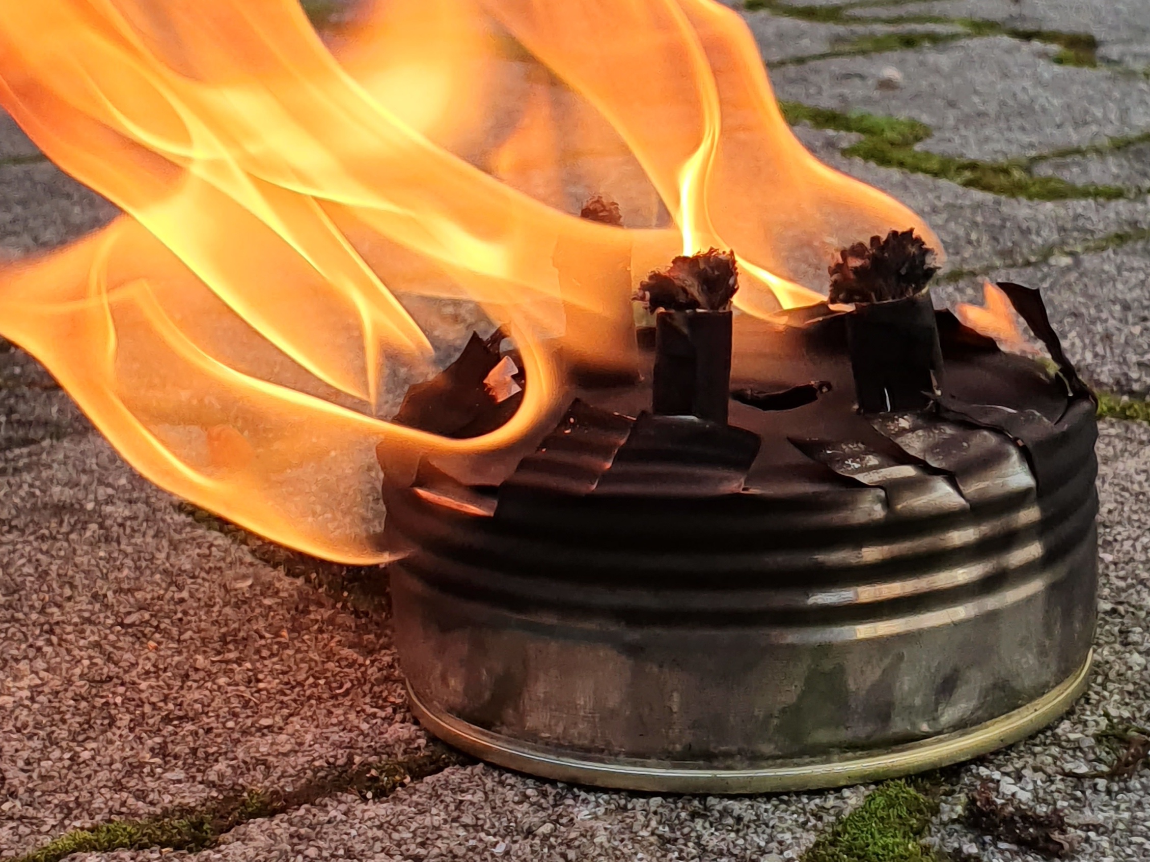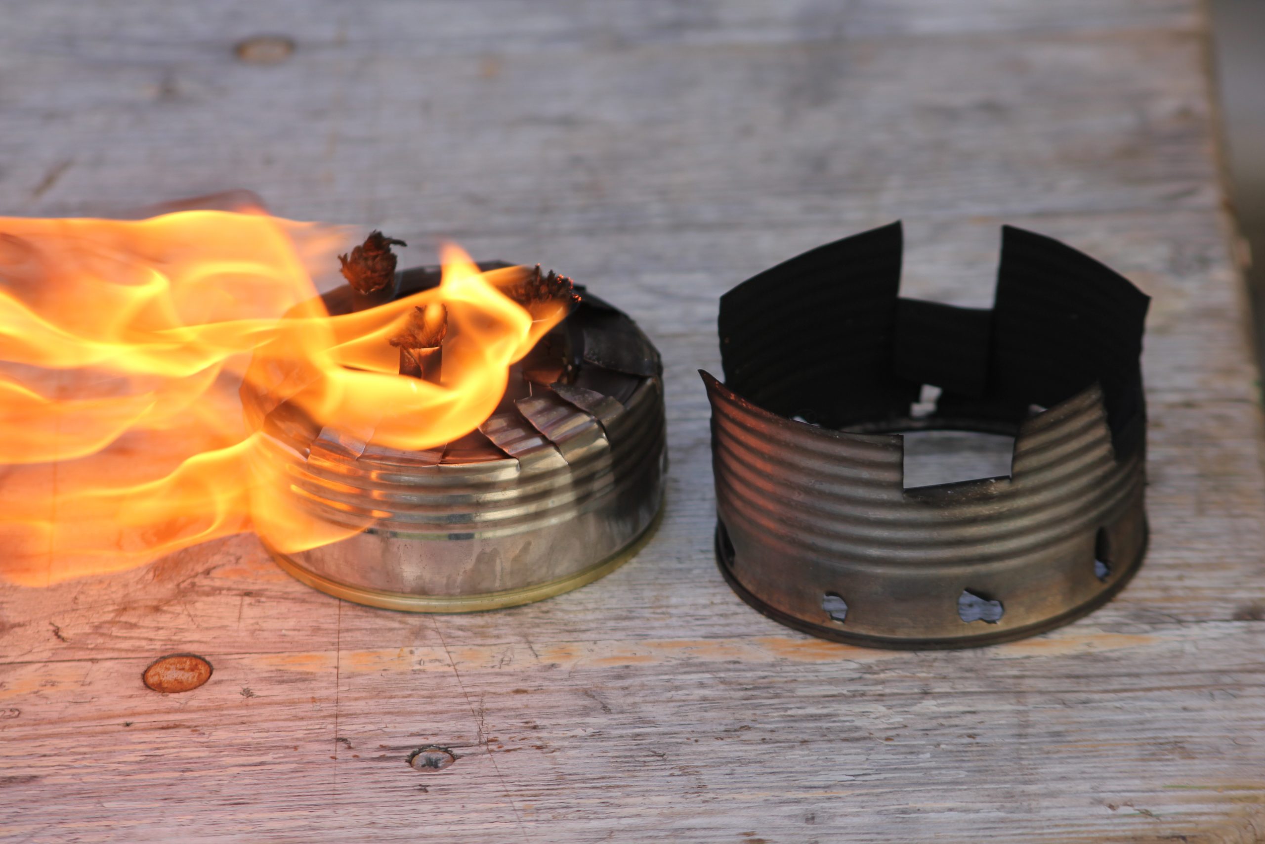 Beim Rumschnüffeln, ob es irgendwo nicht doch noch trockenes Holz oder anderes Hilfreiches gäbe, stießen wir seinerzeit auf einen prall gefüllten Abfalleimer. Darin befanden sich allerlei Arten von Dosen…..und schwupps ging es ans Bauen von Dosenkochern aus Getränkedosen. Die Gruppe hat schnell heißen Tee gehabt und wir mehrere kleine Ersatzkocher, die wir in den kommenden Tagen mit dem Spiritus des echten Kochers betreiben konnten.